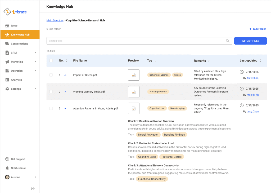 iMBrace turns messy, unstructured research activity into governed intelligence that drives real outcomes.