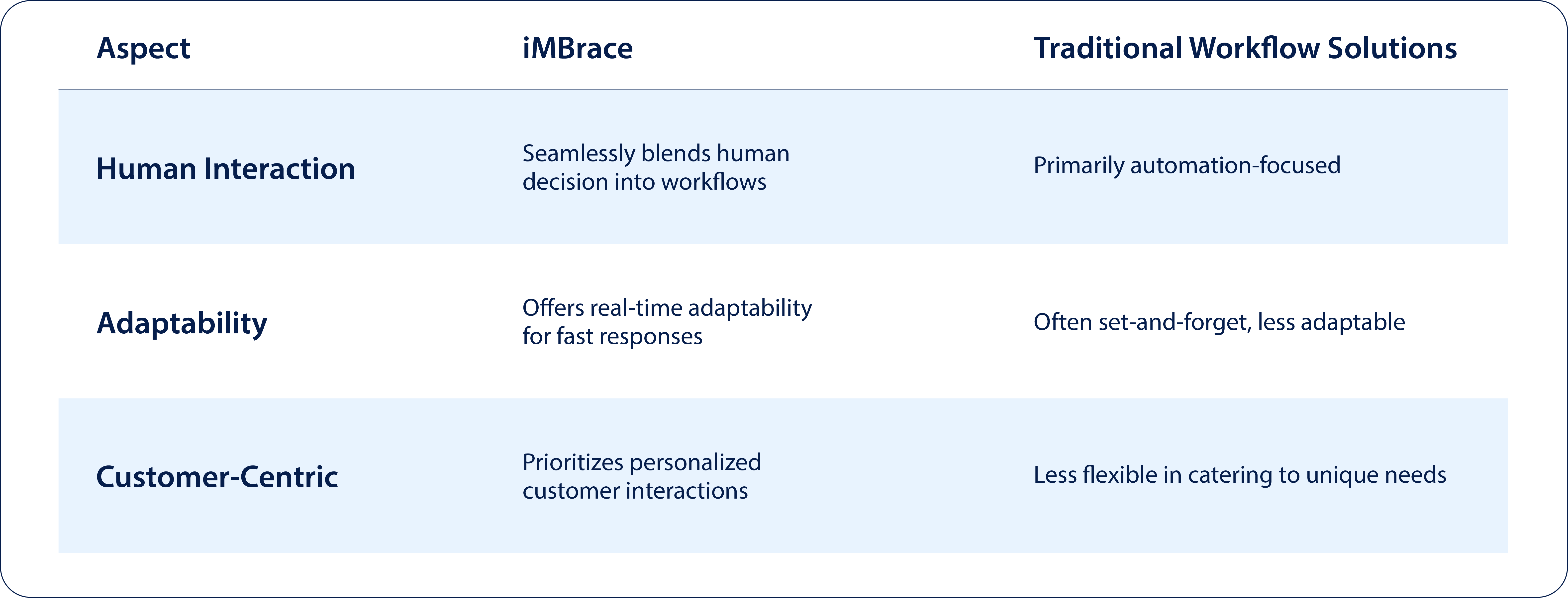 | Fusion of Human Decisions: iMBrace excels in merging human decision with digital workflows, fostering a personal touch that strengthens customer connections. | Learning Curve: Transitioning from traditional workflow solutions to iMBrace might involve a learning curve for businesses. |
