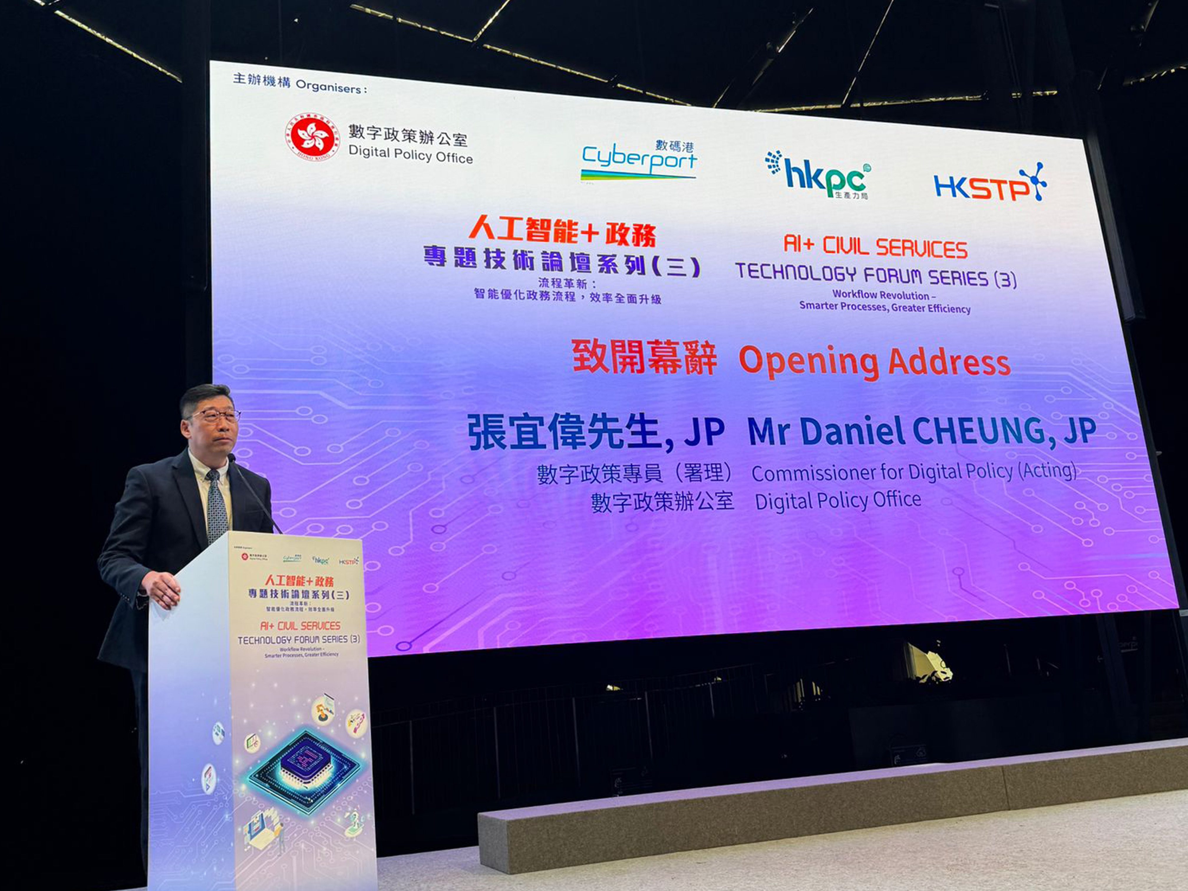 The Acting Commissioner for Digital Policy, Mr Daniel Cheung, delivering the opening address on enhancing public service efficiency through AI.