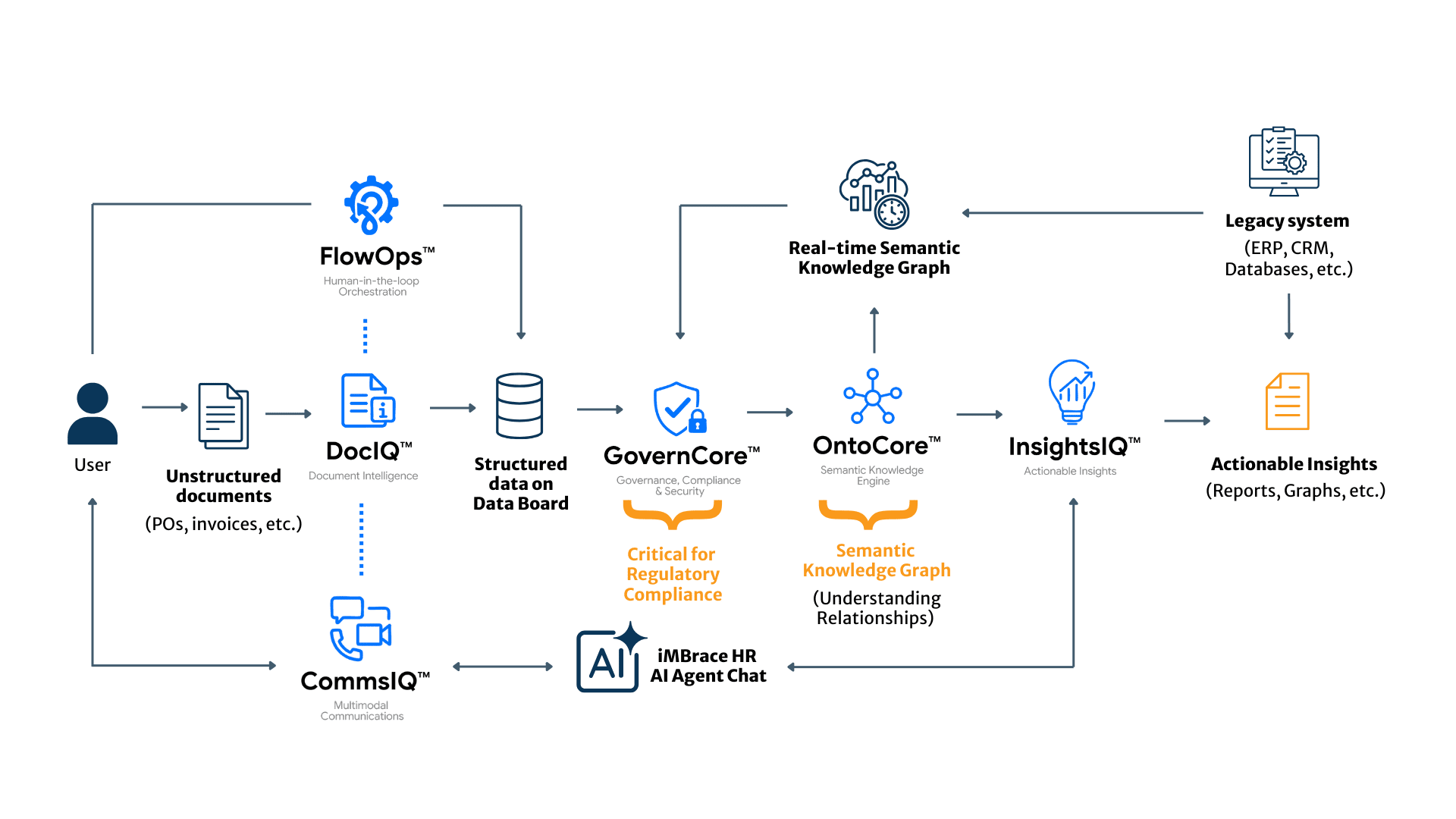 When unstructured documents arrive, CommsIQ™ and DocIQ™ instantly capture, extract, and convert them into structured data. GovernCore™ then ensures this data meets strict regulatory compliance before OntoCore™ maps it against organizational policies to establish context. This creates a real-time semantic knowledge graph that connects seamlessly to your legacy systems (ERP, CRM, databases). Finally, InsightsIQ™ transforms this data into actionable intelligence—such as reports and graphs—that users can easily access through the AI Agent Chat feature. Orchestrating this entire journey is FlowOps™, which keeps human staff seamlessly in the loop for final approvals and edge cases.