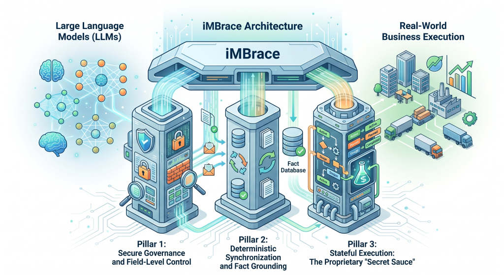 iMBrace is engineered to address the “missing link” between large language models and real-world business execution. Its architecture is built upon three proprietary technological pillars designed to ensure that AI adoption is secure, factual, and manageable.