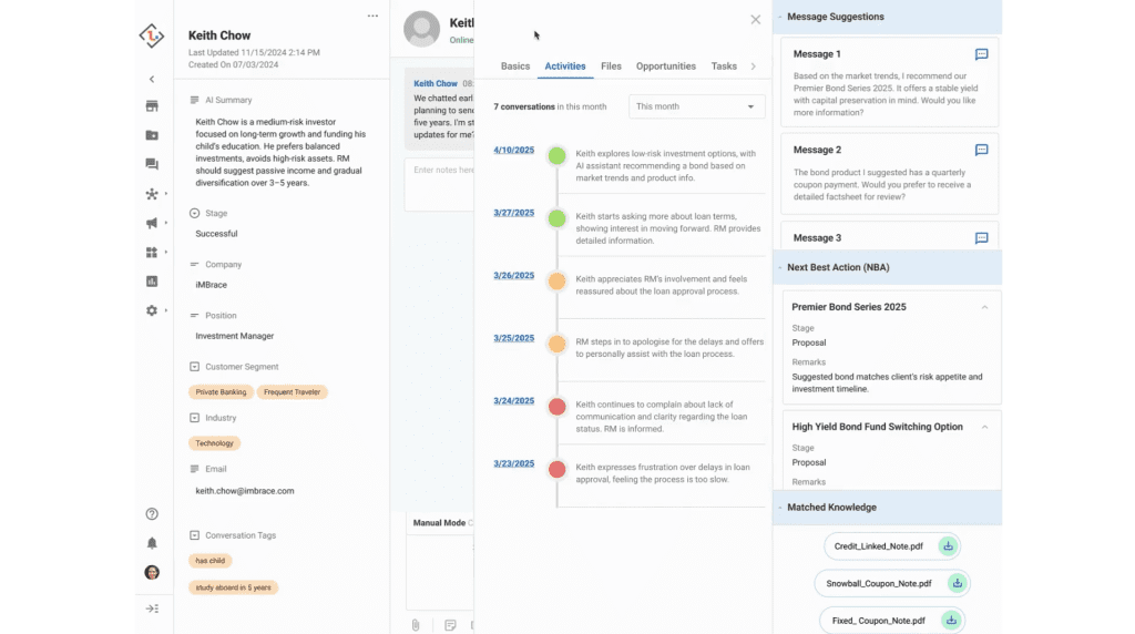 In the highly regulated FSI sector, iMBrace is the clear market leader. Banks use iMBrace for “AI Messaging Compliance,” ensuring that every client interaction on WhatsApp or WeChat is captured, policy-checked, and stored for audit. Relationship Managers (RMs) utilize iMBrace as a “long-term memory,” providing them with live prompts and auto-summaries during client meetings to ensure consistent, veteran-level service.