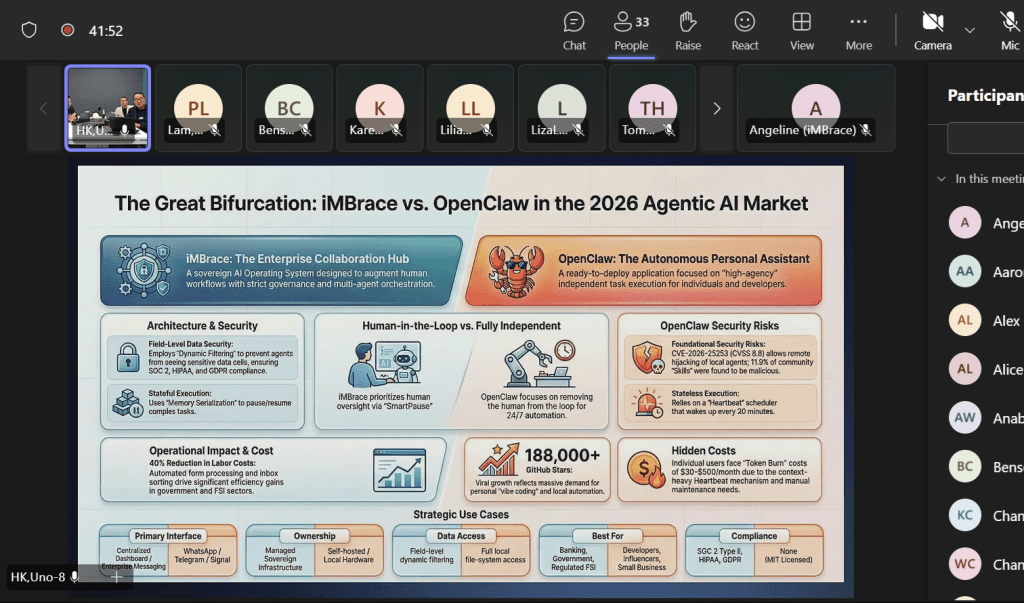 The “Battle Card” is not about which tool is “better” in a vacuum; it is about which tool is appropriate for the environment. For the individual developer at home, OpenClaw is a dream. For the financial relationship manager, the government clerk, or the corporate marketing team, iMBrace is the sovereign AI OS that makes the “agentic workforce” a safe and scalable reality. In the agentic era, winners make intentional architecture decisions—building the secure, open, and adaptable framework that turns AI pilots into enterprise-wide value.