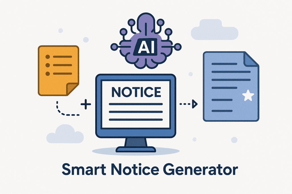Creates public notices, memos, or announcements from templates using key points or brief inputs. This reduces drafting effort and ensures a clear communication.